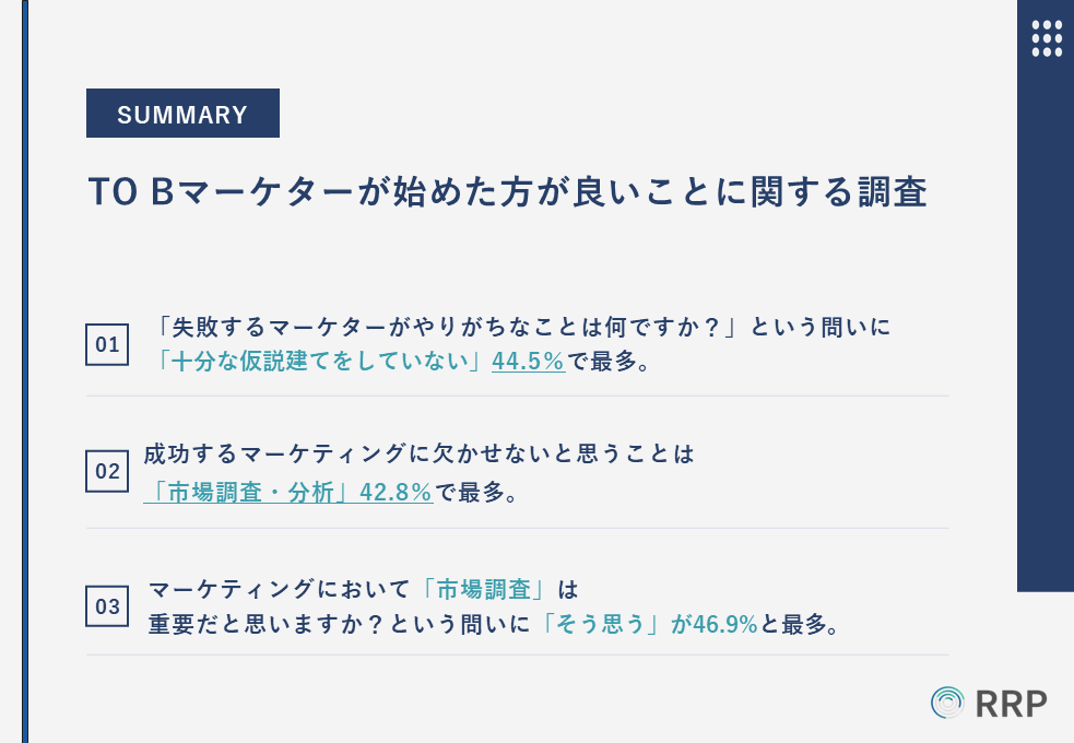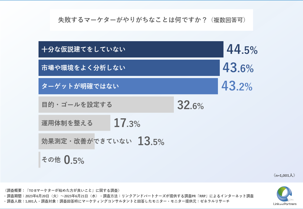 調査結果から、「失敗するマーケターがやりがちなこと」は、上位から「十分な仮説建てをしていない」、「市場や環境をよく分析しない」、「ターゲットが明確ではない」ということが分かりました。