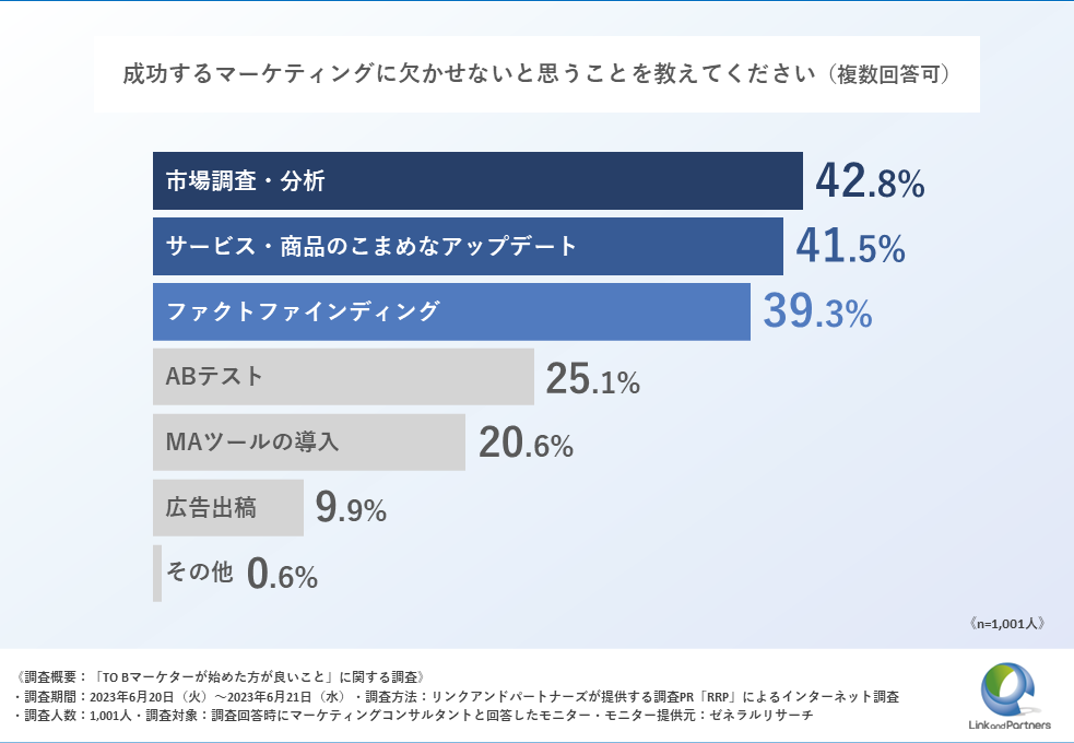 「成功するマーケティングに欠かせないと思うこと」は「市場調査・分析」が42.8%で最多