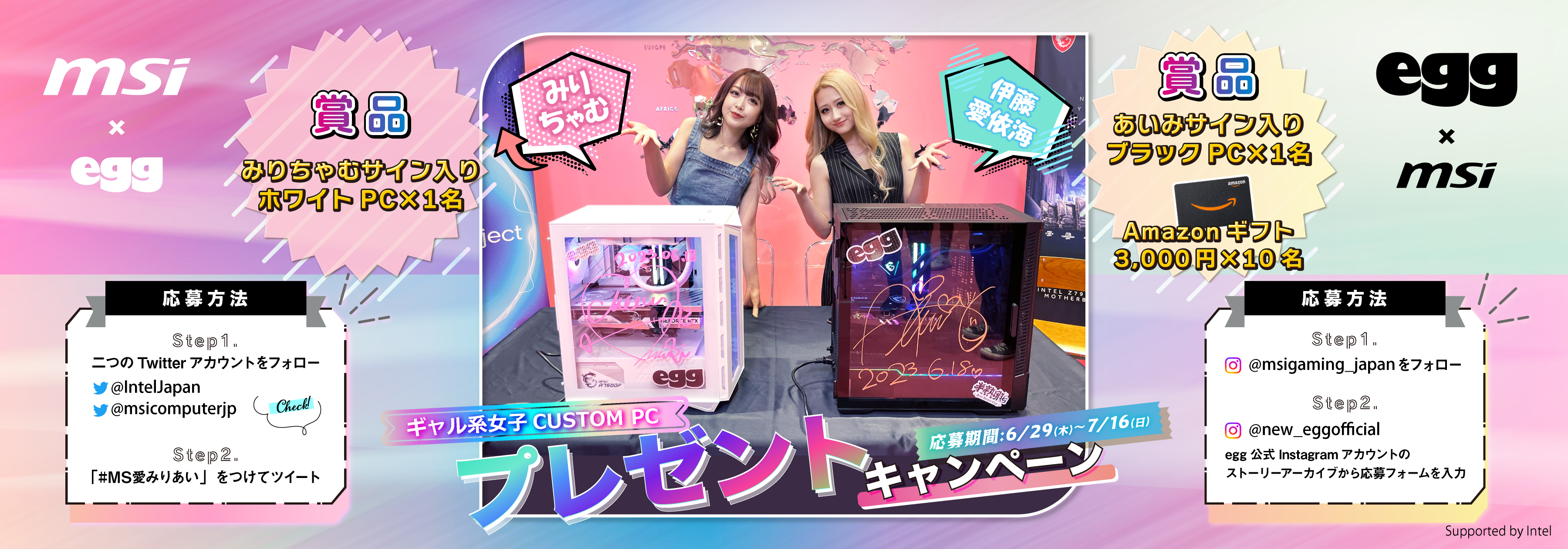 2023年6月18日(日)に行われた前代未聞のMSI x eggコラボレーション生配信【ギャル系女子CUSTOM PC生配信・自作PCチャレンジ】でみりちゃむさん、伊藤愛依海さんが製作した2台のCUSTOM PCを抽選でプレゼントいたします。