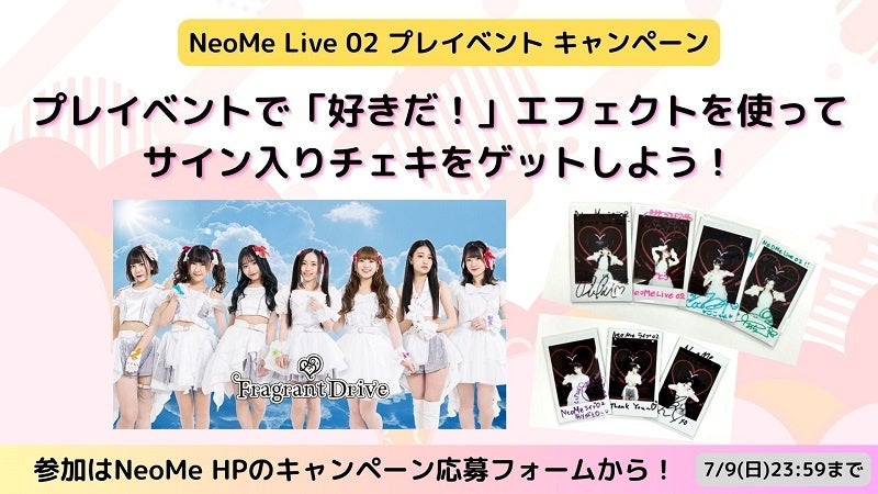 7月5日(水)開催のNeoMe Live 02プレイベント中にFragrant Driveの「好きだ!」エフェクトを使ってイベントを盛り上げて下さった方の中から抽選でFragrant Driveメンバーのサイン入りチェキを各1名様にプレゼント!