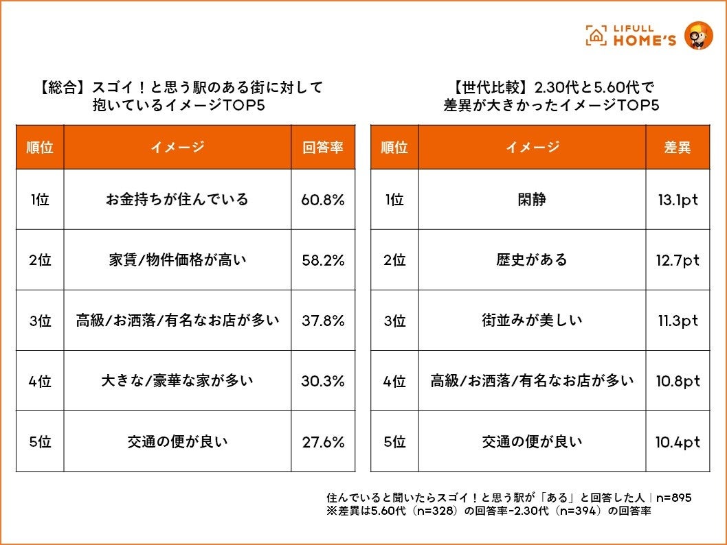 「スゴイ!」と思う駅がある人に対し、その駅のある街に対してのイメージを聞いたところ、1位が「お金持ちが住んでいる」(60.8%)、2位以降は「家賃/物件価格が高い」(58.2%)、「高級/お洒落/有名なお店が多い」(37.8%)と続きました。