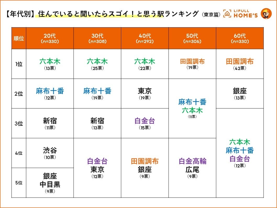 年代別ランキング: 20~40代は「六本木」、5.60代は「田園調布」