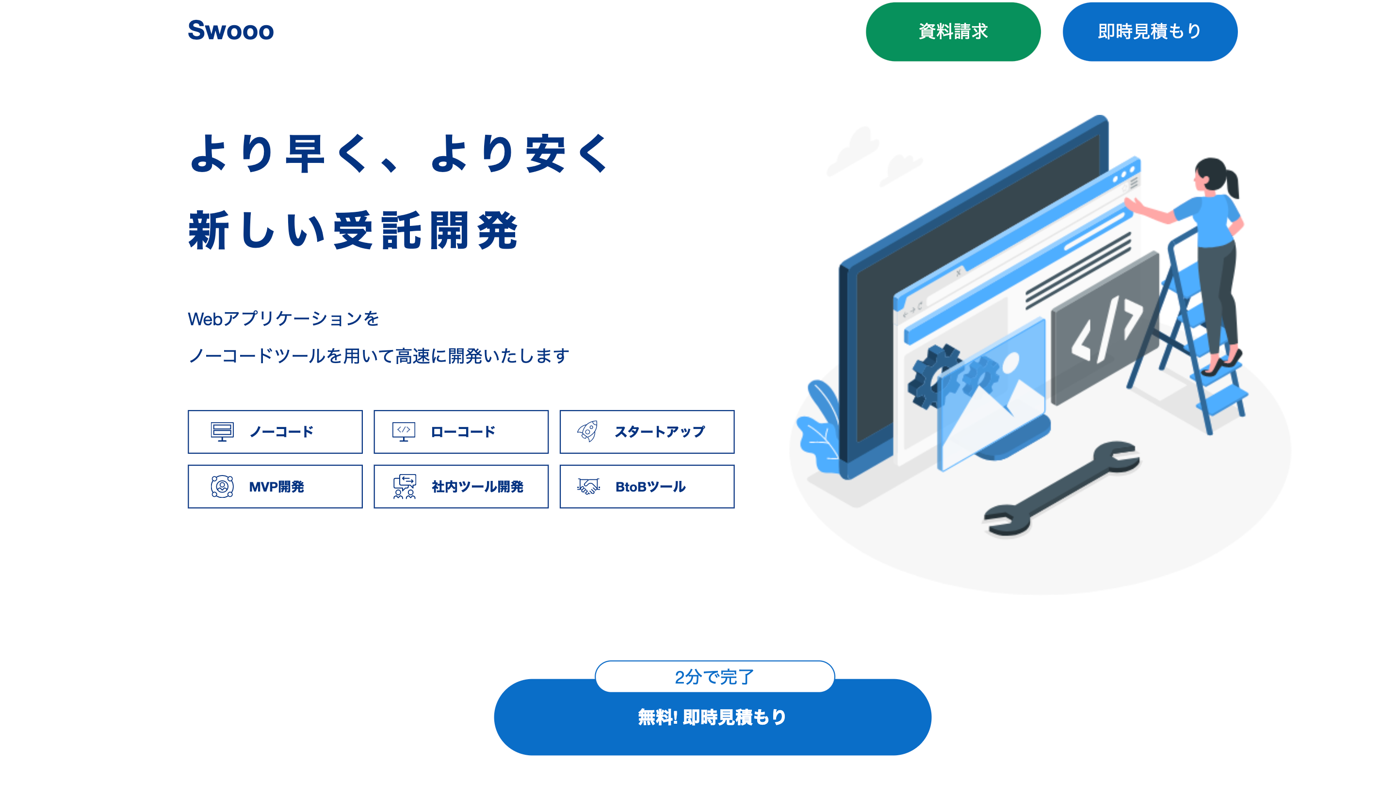 Swoooは、「コーディング不要のノーコードツールを活用し、従来よりもコストを抑え、そして早く実現させる」webシステム開発サービスです。