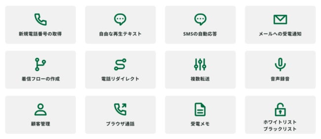 電話応答の分岐を自由に設定でき、AI自動応答やSMS返信・電話転送・アプリ転送・顧客管理(CRM)といったフロントオフィスの業務を支える幅広く機能を利用可能です。