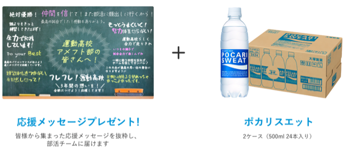 本キャンペーンでは、10件以上の応援メッセージが集まった部活チームを対象に、先着と抽選で飲料などの応援商品と集まった応援メッセージを差し入れとして進呈します。