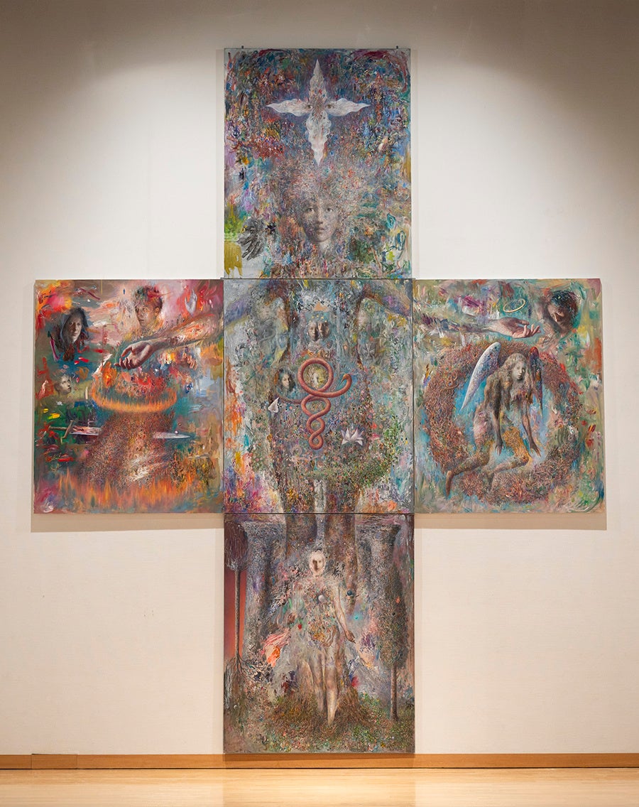 山田孟は、 日本の文化や歴史、それらを自己の解釈の元、現代的な価値観や視覚情報と照らし合わせ、画面上に油彩と現代的なマテリアルのレイヤー(層)によって表現する方法を試みています。また幼少期からアニメやゲームに影響を受け、アーティストとしての活動以外にも、キャラクターデザインやイラストレーター、デッサン講師などと多岐にわたる活動をしています。