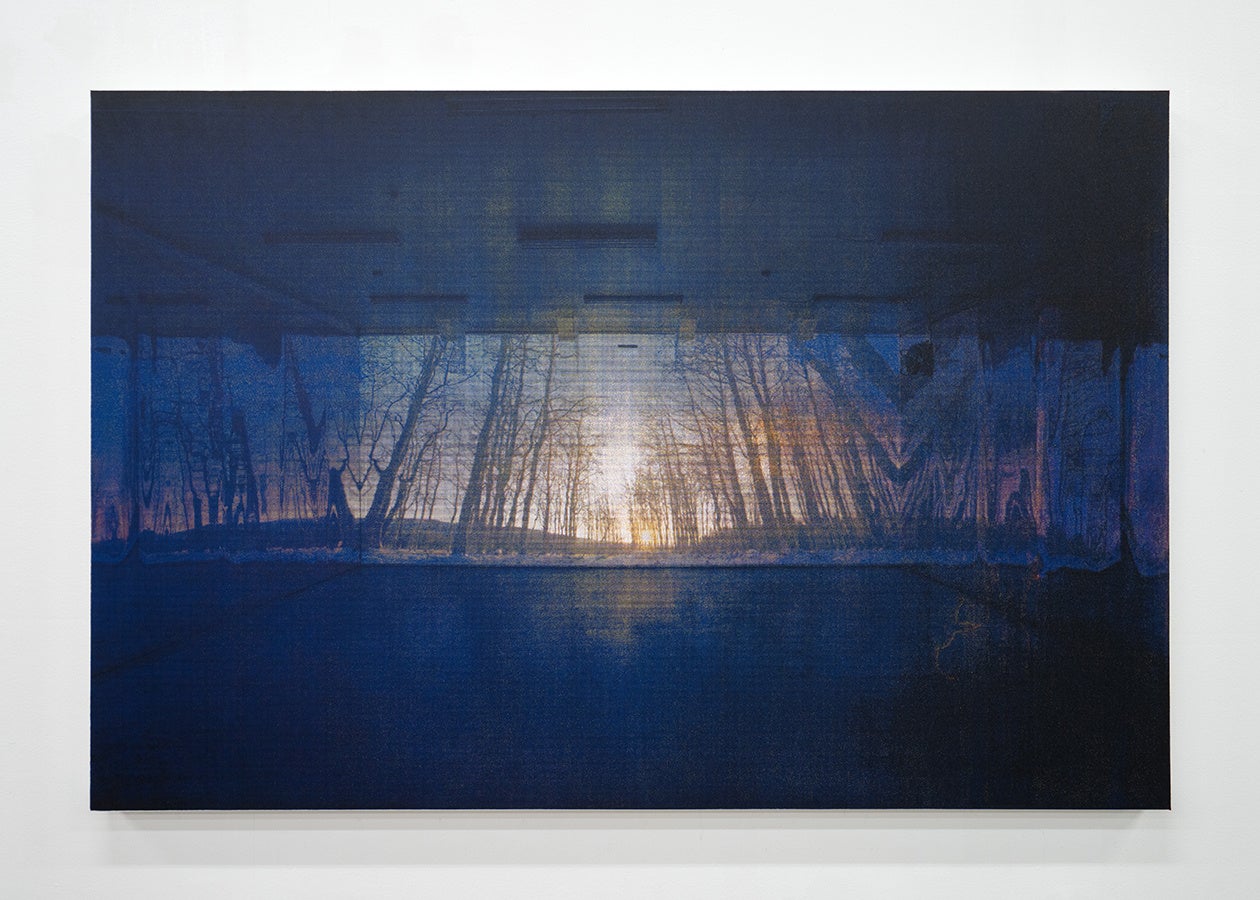 増田将大は、対象となる何気ない風景を撮影し、その画像をプロジェクターで同じ場所に投影しています。再び同じ視点で撮影するというプロセスを複数回くり返し、さらにそれをキャンバスの上にシルクスクリーンで刷り重ねることで、多数の図像と絵具の重なり、掠れを孕んだイメージを映し出しています。