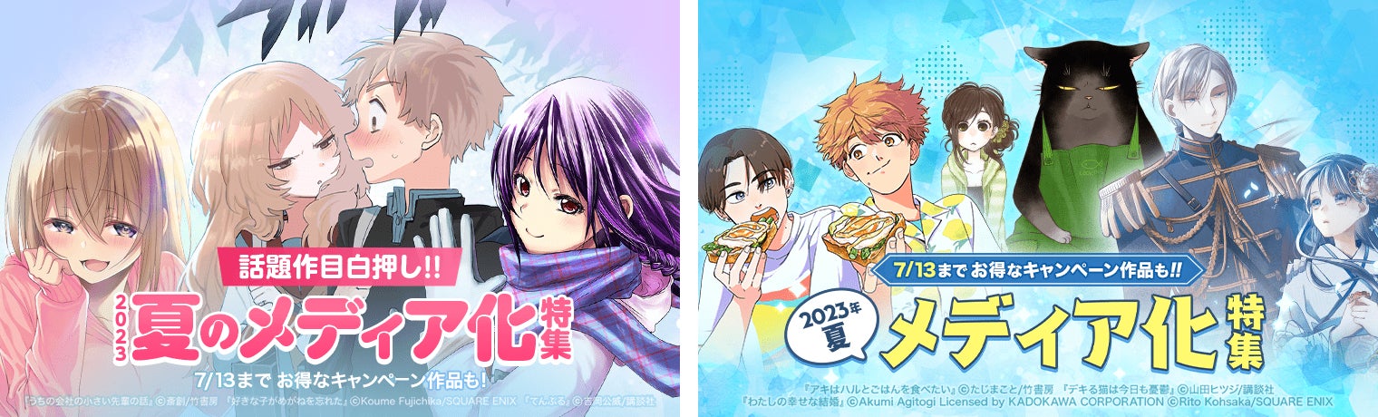今回の特集では、『うちの会社の小さい先輩の話』『アキはハルとごはんを食べたい』(竹書房)、『好きな子がめがねを忘れた』『わたしの幸せな結婚』(スクウェア・エニックス)、『てんぷる』『デキる猫は今日も憂鬱』(講談社)などの人気メディア化作品を集めました。