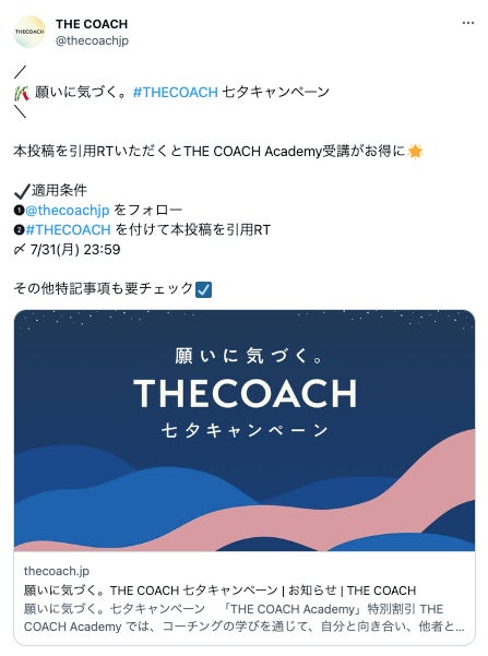 期間内に、THE COACH Twitterアカウント(https://twitter.com/thecoachjp)をフォローし、指定の投稿をリツイートいただくと、THE COACH Academy受講料22,000円(税込)がお得になります。