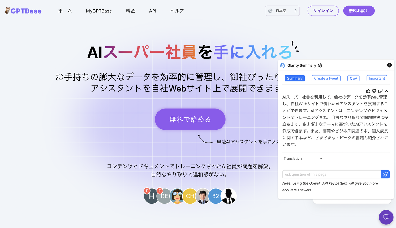GPTBaseは、AIスーパー社員を利用して、会社のデータを効率的に管理し、自社Webサイトで優れたAIアシスタントを展開することができます。AIアシスタントは、コンテンツやドキュメントでトレーニングされ、自然なやり取りで問題解決に役立ちます。さまざまなテーマに基づいたAIアシスタントを作成できます。また、書籍やビジネス関連の本、個人成長に関する本など、さまざまなトピックの書籍も紹介されています。