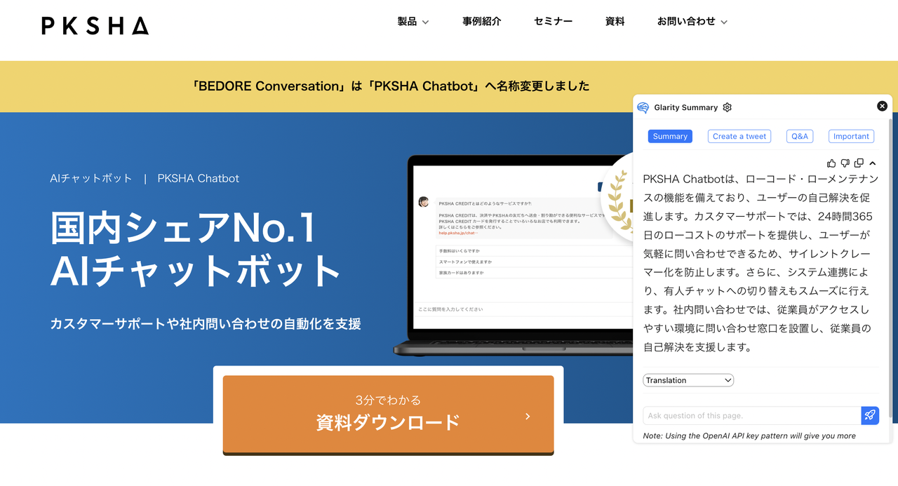PKSHA Chatbotは、ローコード・ローメンテナンスの機能を備えており、ユーザーの自己解決を促進します。カスタマーサポートでは、24時間365日のローコストのサポートを提供し、ユーザーが気軽に問い合わせできるため、サイレントクレーマー化を防止します。さらに、システム連携により、有人チャットへの切り替えもスムーズに行えます。社内問い合わせでは、従業員がアクセスしやすい環境に問い合わせ窓口を設置し、従業員の自己解決を支援します。