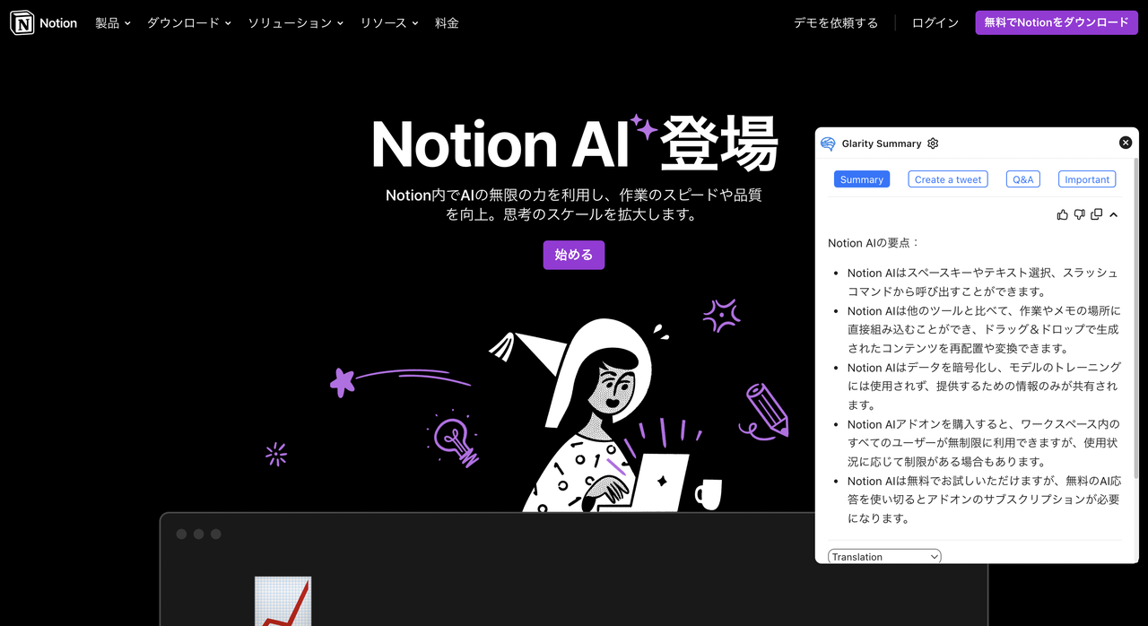 Notion AIはスペースキーやテキスト選択、スラッシュコマンドから呼び出すことができます。他のツールと比べて、作業やメモの場所に直接組み込むことができ、ドラッグ&ドロップで生成されたコンテンツを再配置や変換できます。データを暗号化し、モデルのトレーニングには使用されず、提供するための情報のみが共有されます。