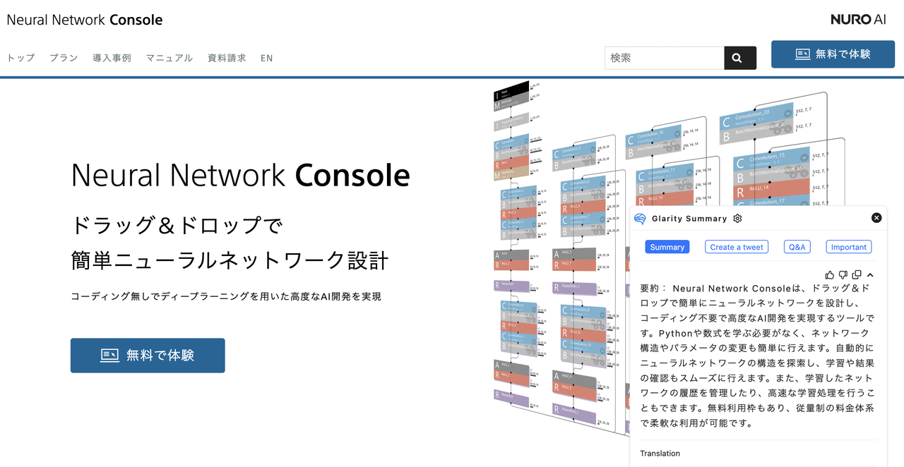 Neural Network Consoleは、Pythonや数式の知識がなくてもディープラーニングを利用した高度なAI開発が可能です。ネットワークの構造やパラメータの変更などをコーディングする必要がなく、ドラッグ&ドロップで編集ができます。また、ニューラルネットワークの構造自動探索や学習の履歴管理、高速な学習実行などの機能も備えています。ツールの利用には簡単な登録が必要で、無料利用枠も提供されていますが、追加の機能や利用量に応じて従量制の月額料金が発生します。お問い合わせや相談も受け付けており、開発の支援も可能です。
