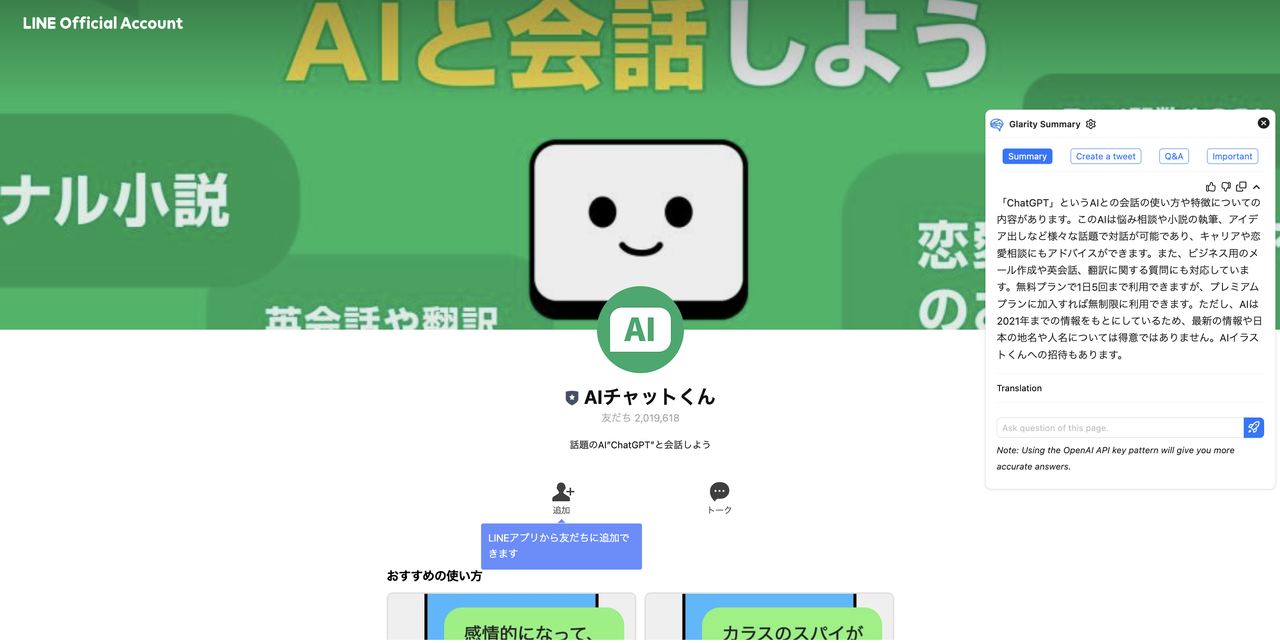 LINE AIチャットくんは、友達のように会話ができるAIです。悩み相談や小説の執筆、アイデア出しなど様々な話題で対話が可能であり、キャリアや恋愛相談にもアドバイスができます。また、ビジネス用のメール作成や英会話、翻訳に関する質問にも対応しています。無料プランで1日5回まで利用できますが、プレミアムプランに加入すれば無制限に利用できます。ただし、最新の情報や日本の地名や人名については得意ではありません。AIイラストくんへの招待もあります。