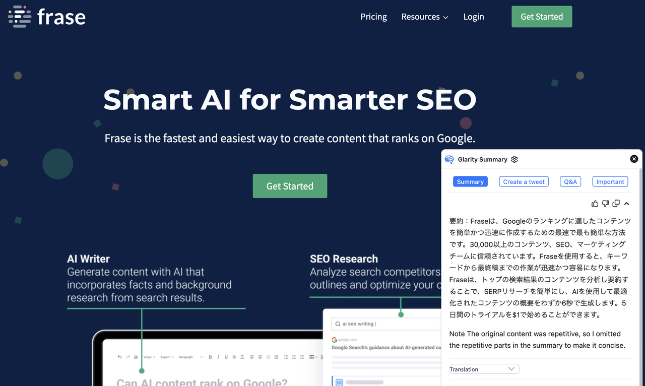 Fraseは、Googleのランキングに適したコンテンツを簡単かつ迅速に作成するための最速で最も簡単な方法です。30,000以上のコンテンツ、SEO、マーケティングチームに信頼されています。Fraseを使用すると、キーワードから最終稿までの作業が迅速かつ容易になります。Fraseは、トップの検索結果のコンテンツを分析し要約することで、SERPリサーチを簡単にし、AIを使用して最適化されたコンテンツの概要をわずか6秒で生成します。5日間のトライアルを$1で始めることができます。