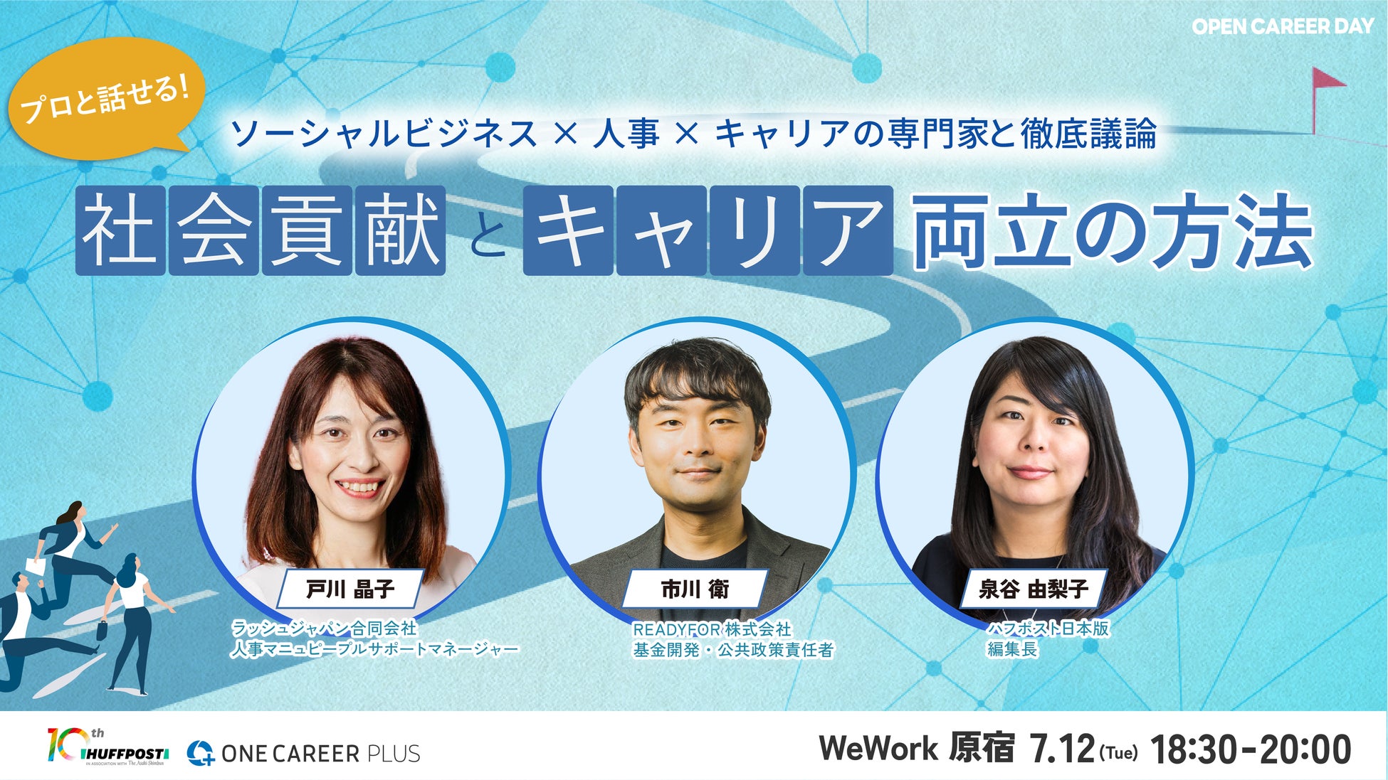 BuzzFeed Japan株式会社(本社 東京都渋谷区、以下、BuzzFeed Japan)が運営するメディア「ハフポスト日本版」は、10周年企画「未来を作る」イベント第4弾として、次のキャリアが見える、転職サイト「ONE CAREER PLUS」を運営するワンキャリアとコラボし、社会貢献をキャリアの軸にする方法を考えるイベント「プロと話せる!『社会貢献』と『キャリア』両立の方法 〜ソーシャルビジネス×人事×キャリアの専門家と徹底議論〜」を7月12日(水)に開催します。