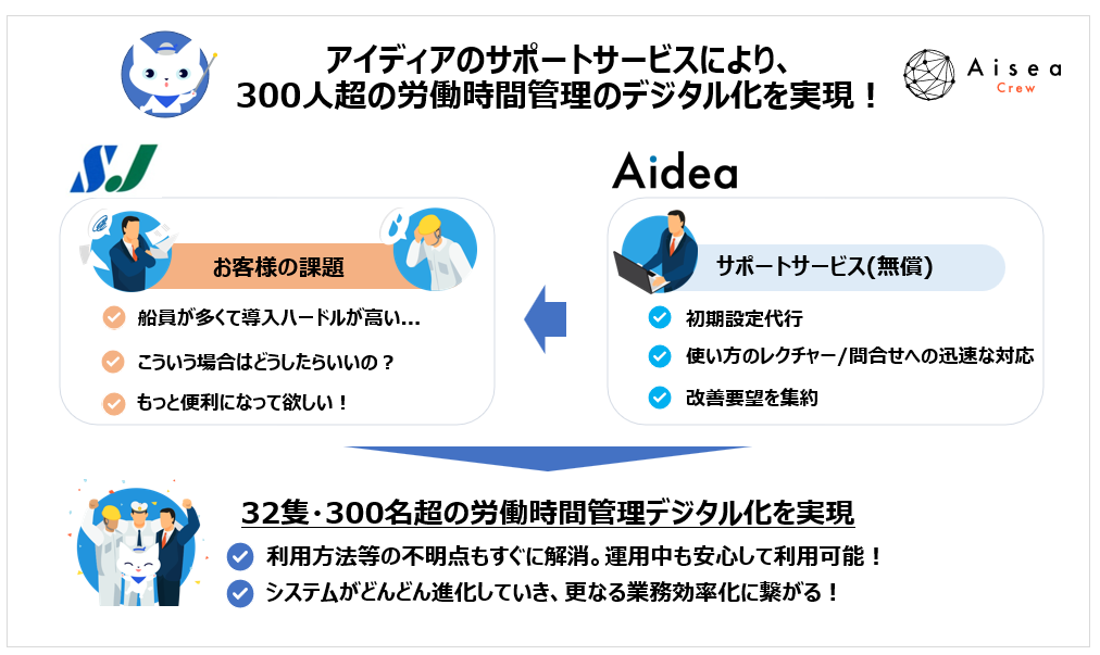 そのような中、アイディアが提供する労働時間管理システム『Aisea Crew』の導入に至った決め手は、手厚い無償のサポートサービスでした。