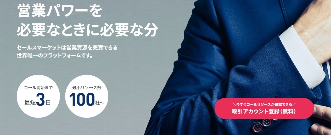 『セールスマーケット』は、営業が不足している企業に対し、品質の安定性とコストパフォーマンスの充実を実現するため、ワンクリックでのコール購入が可能な操作の分かりやすいUI画面と、イメジン独自の審査に基づいたコール資源の提供を行います。このサービスを通じて、企業は迅速かつ容易に必要な営業資源を確保し、柔軟な営業戦略の展開やコスト削減を実現することができます。
