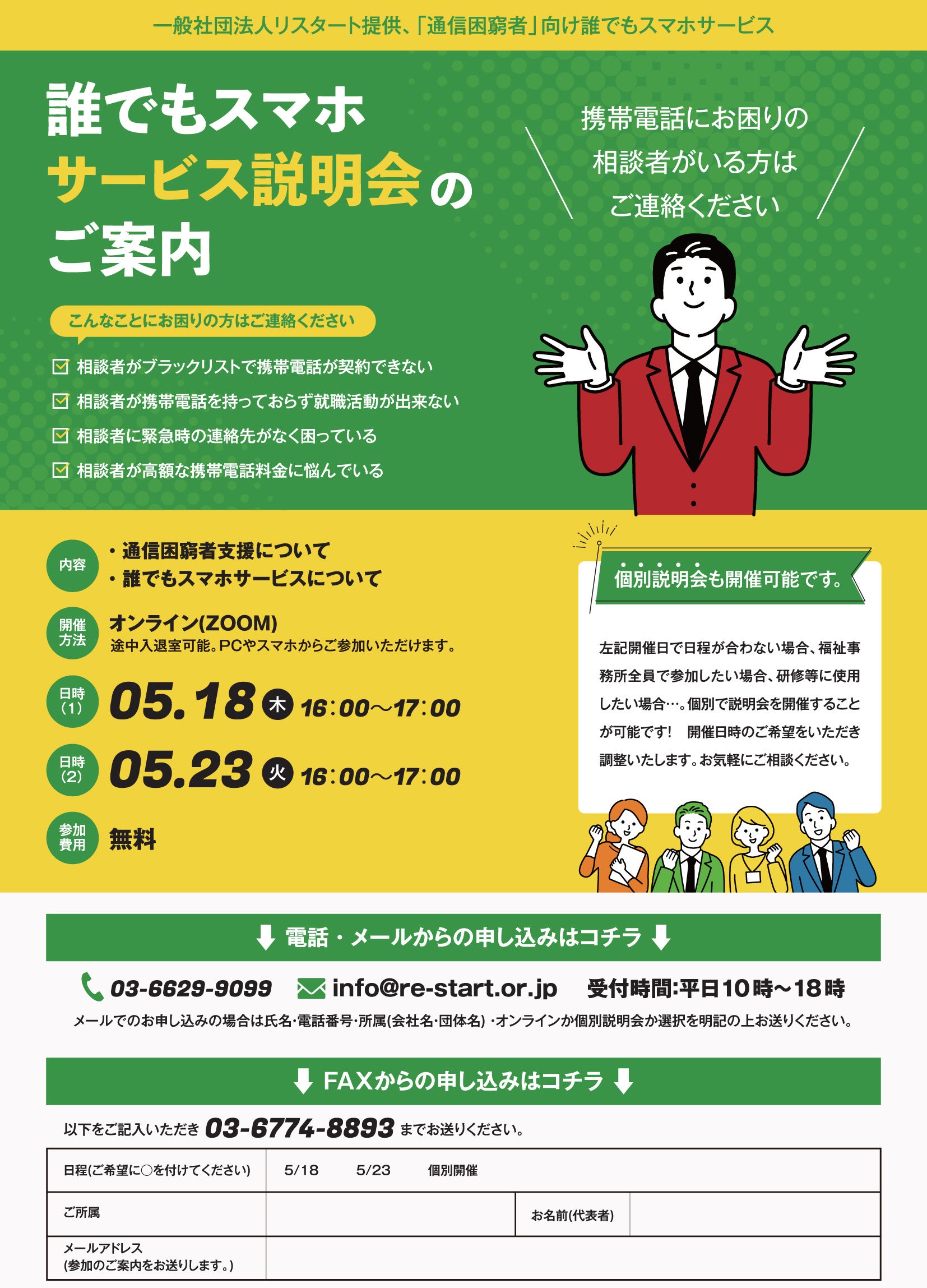 事業内容:誰でもスマホの取次店として、行政等の支援窓口へ情報発信等を行っています。困窮者支援窓口や社会福祉協議会の職員様とのつながりを強化し、全国でより多くの通信困窮者の方々の支援にお役立ちできればと思っております 。