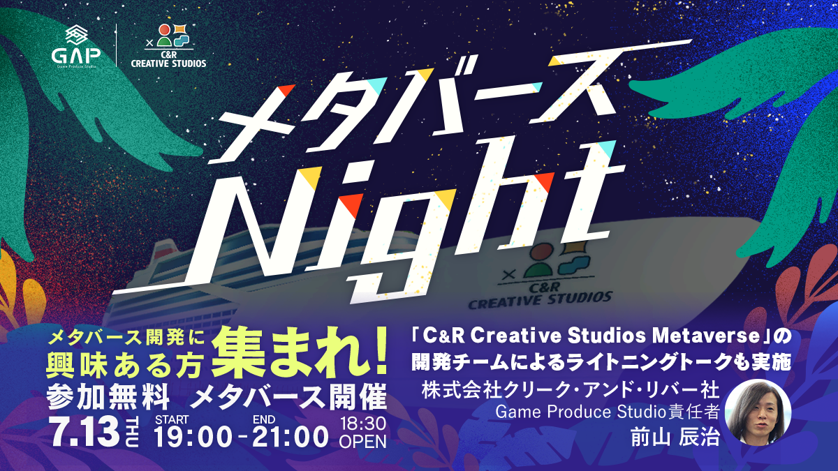 ビジネスモデルの変革やクリエイティブのアウトプットにも影響を与えつつあるメタバースの発展。C&R社では、多くのクリエイターやビジネスパーソンより、今後のメタバースの展開や動向を把握し、ビジネスやクリエイティブに落とし込んでいきたいという声を数多くお寄せいただいております。今回の「メタバースNight」では、そんな声にお応えすべく、発展目覚ましい“メタバース”をテーマにした交流イベントを開催することとなりました。