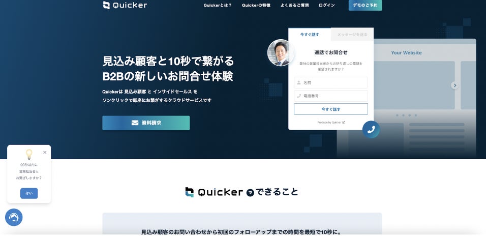 Quickerはたった「ワンステップ」で、Webサイトに訪問したお客様と営業担当者を繋げ、これまでに無いシームレスな「お問い合わせ」の体験を提供します。
