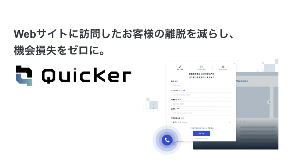 Quickerはたった「ワンステップ」で、Webサイトに訪問したお客様と営業担当者を繋げ、これまでに無いシームレスな「お問い合わせ」の体験を提供します。