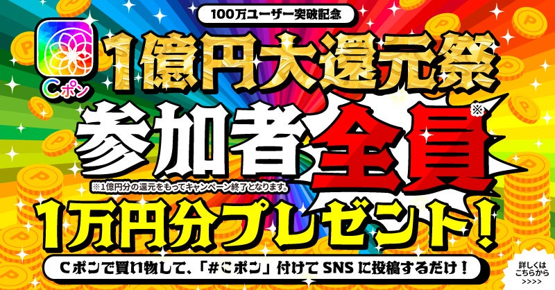 全国の加盟店・ネットショップで、いつでも20%お得で使える割引クーポンサービス『Cポン』を運営するKOC・JAPAN株式会社(本社:東京都中央区銀座7-16-21 銀座木挽ビル4階、代表取締役:秋山 博士、以下 KOC)は、ユーザー100万人を突破した記念に1億円大還元祭を開始します。