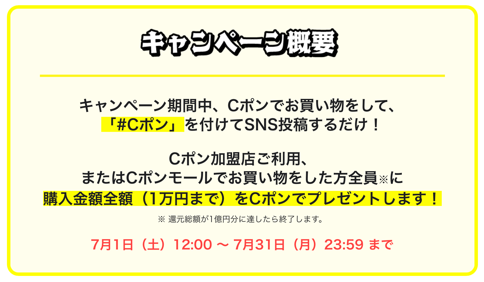 Cポン加盟店利用もしくは、モールで商品購入した方全員に購入額全額(上限1万円)のCポンをキャッシュバックします。キャンペーン期間は、7/1(土)12:00〜7/31(月)23:59になります。