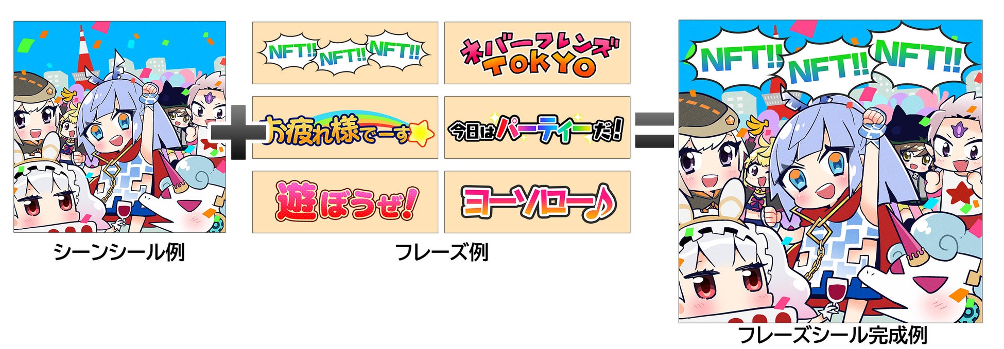 「サイ(再)プレス」は、NFTデジタルシールの「OMJ」を最大値の20ポイントまで貯めると、そのシールの一部のデザインを変化させることができる機能です。キャラクターや4コママンガの色やイラストを変化させたり、フレーズシールでは新しいフレーズが選択できます。「サイプレス」は1度だけ行うことができ、「サイプレス」後は元のデザインに戻すことはできません。第四弾シールの「サイプレス」は、8月11日(木)からご利用いただけます。