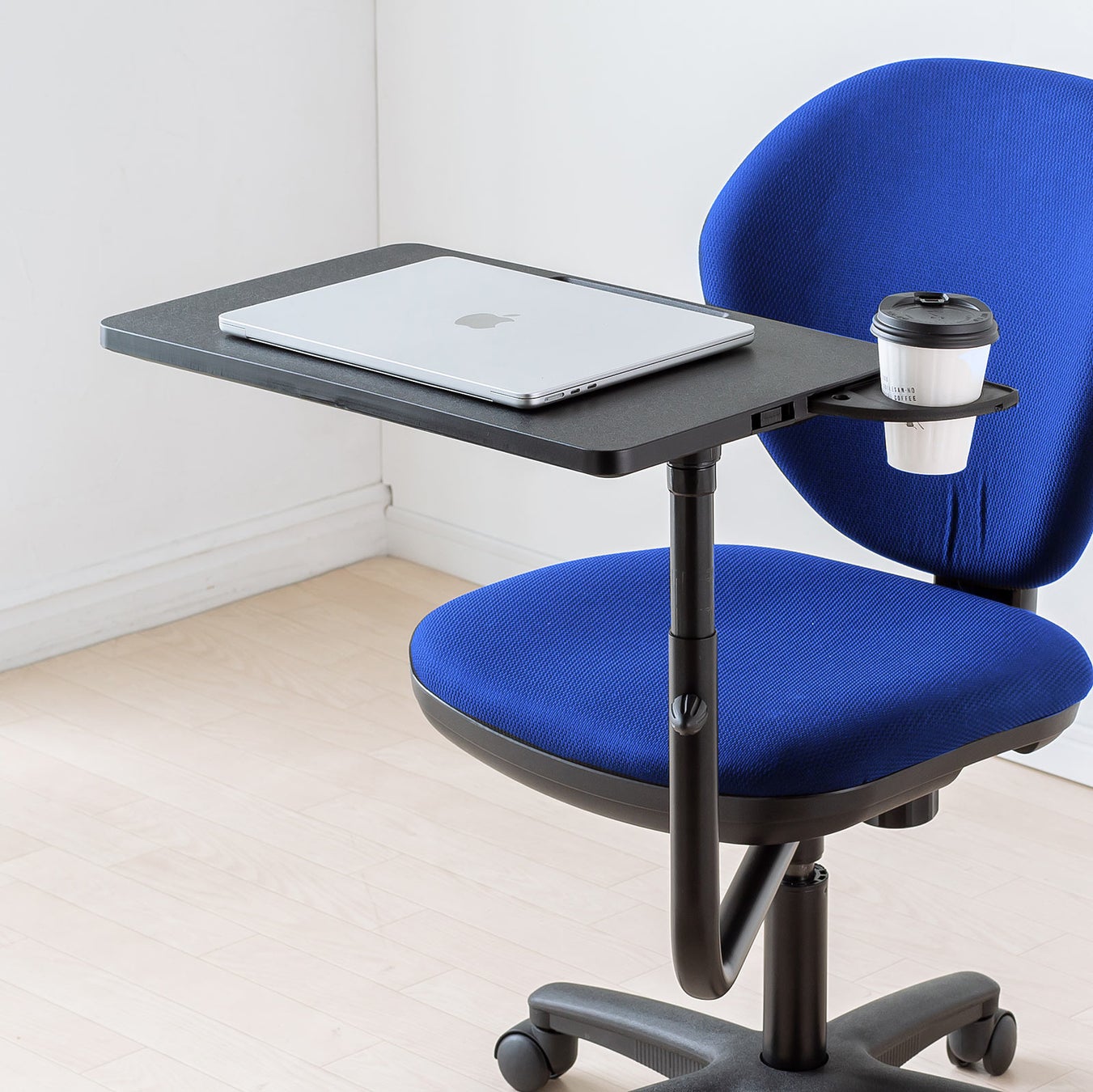 手持ちのオフィスチェアがメモ台付きチェアに変身!チェアのガスシリンダーに装着する後付けデスク。A3サイズの天板に重さ10kgまでの物を乗せられる。使う人に合わせて5段階の高さ調整が可能。ペントレーとカップホルダー付き。【WEB限定商品】【後付けテーブル】のサンワ ダイレクトの通信
