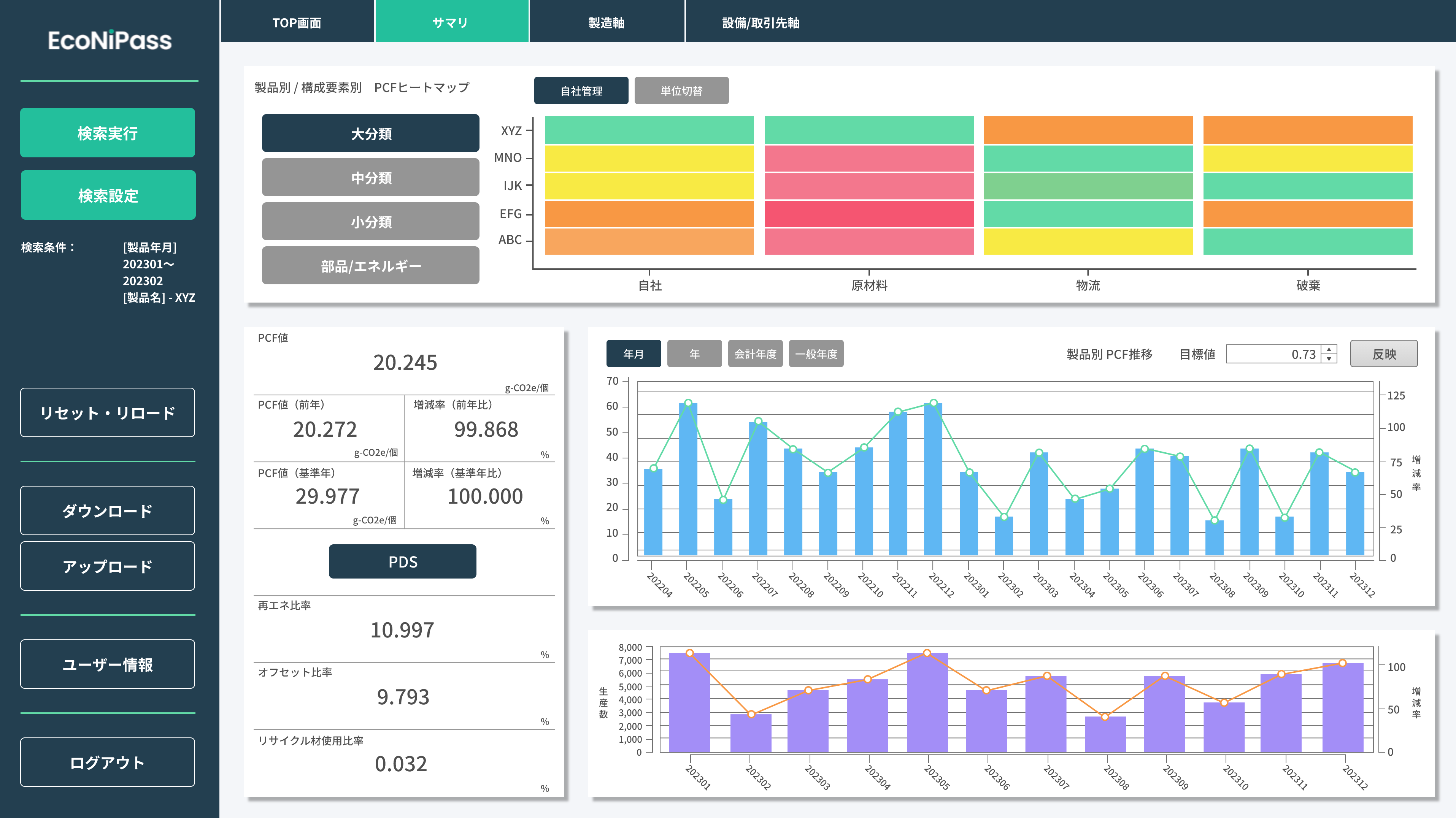 ・生産量、設備ごとのエネルギー使用量等を入力することで、自社の事業活動における製品別CO2 排出量(CFP)、設備別のCO2 排出量を算定・可視化。 ・サプライヤーから部品、原材料にかかるCO2 排出量データを受け取ることで、部品・原材料も含めたCFP の算出も可能。 ・サプライヤーがEcoNiPass を使用していればシステム連携することで、サプライヤーの部品や原材料にかかるデータの共有が可能。(※4) |