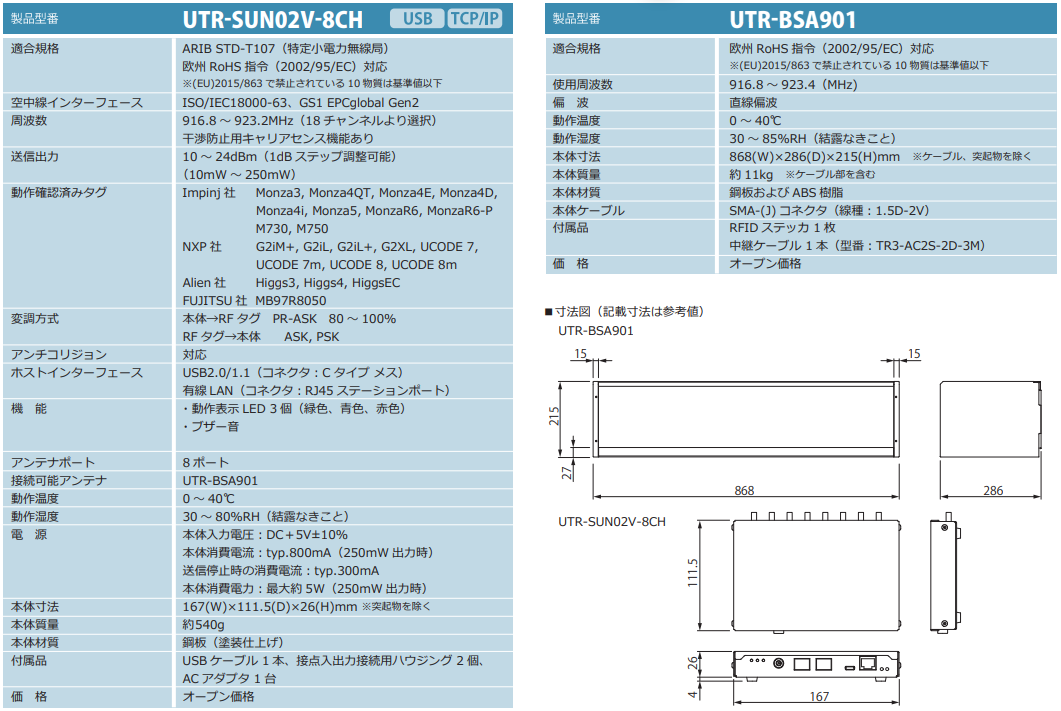 UTR-SUN02V-8CH(リーダライタ)、UTR-BSA901(アンテナ) |