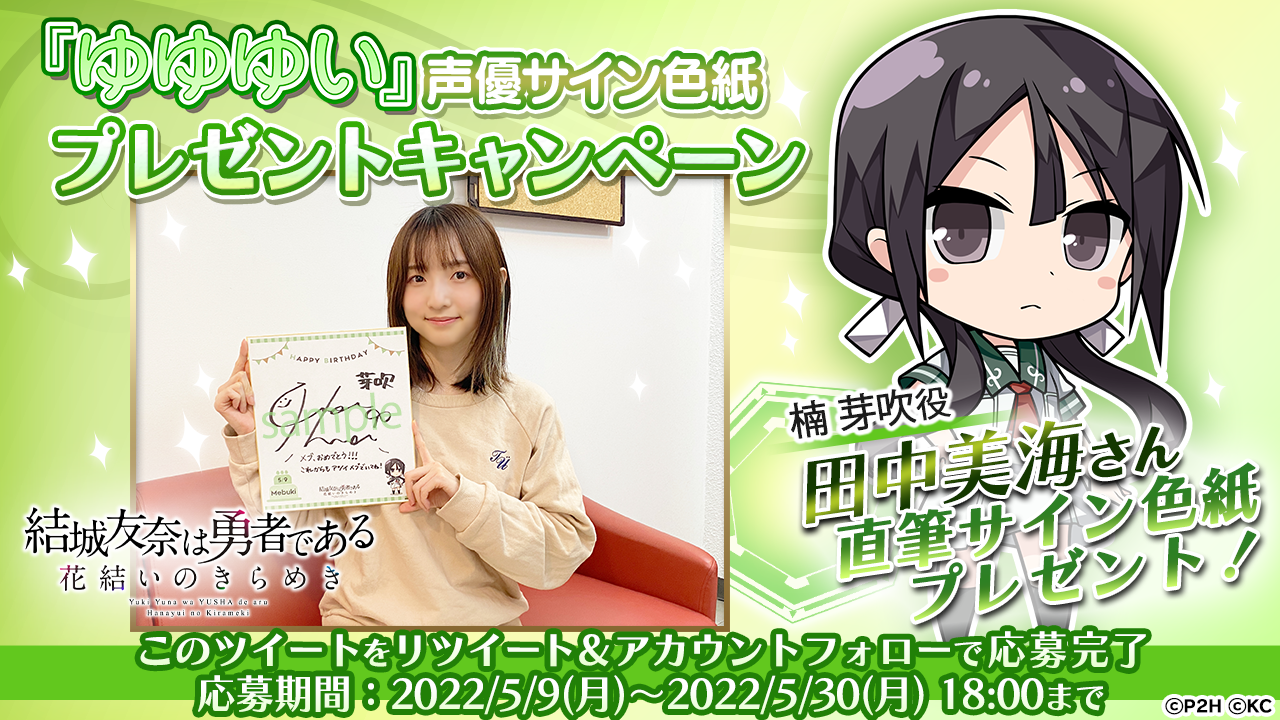 『ゆゆゆい』公式Twitterをフォロー&該当ツイートをリツイートすることで、楠芽吹役の田中美海さんサイン色紙プレゼントへの応募が出来ます。