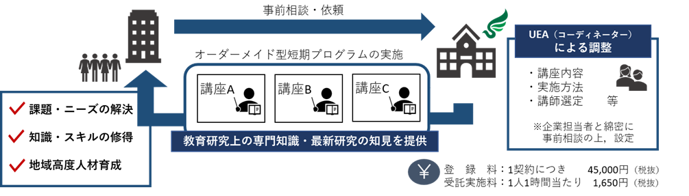 当プログラムは、企業等の課題やニーズに合わせて、研修内容をカスタマイズできるオーダーメイド型の教育研修プログラムであり、本学教員が教育研究上の専門知識を提供することにより、地域高度人材の育成に貢献することを目指します。