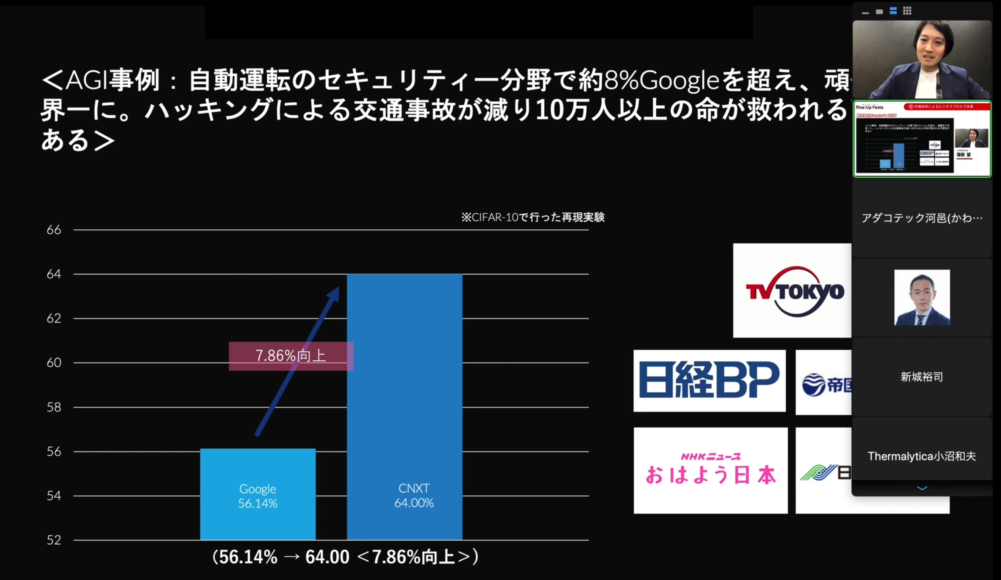 代表の窪田は、クリエイターズネクストが注力している、AGI(汎用型人工知能)の自社特許を活用した事業展開についてプレゼンテーションをしました。現在、多くの場面で活用されているANI(特化型人工知能)は単一の課題しか解けないのに対して、AGI(汎用型人工知能)は複数の課題を解くことができ、様々な産業領域での展開が期待されています。AGI分野における特許取得件数は、Googleは2件、Appleは1件に対してクリエイターズネクストは8件と世界1位の立場にあります。