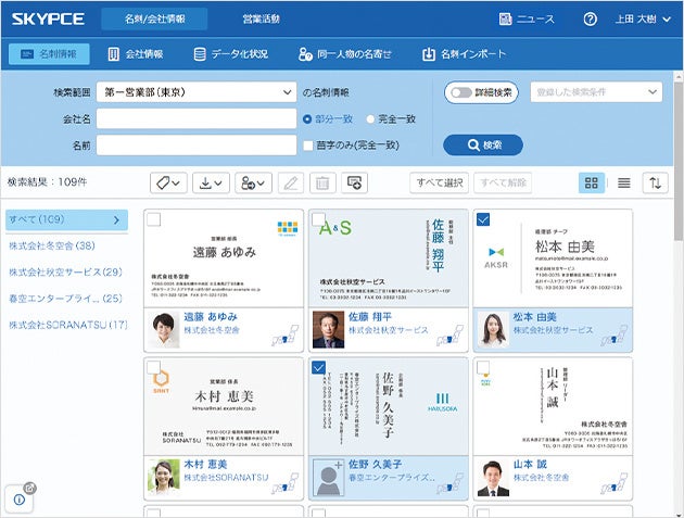 シンプルな画面構成で、マニュアルがなくても直感的に使える「使いやすさ」が「SKYPCE」の魅力です。検索性に優れた名刺情報閲覧画面で、膨大な名刺の中から必要な情報を簡単かつスピーディに確認いただけます。