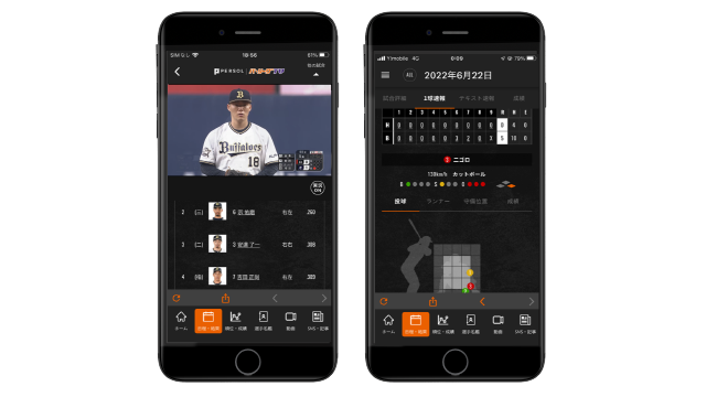 一軍・二軍公式戦のLIVE視聴*1と同時に、一軍公式戦では試合情報(得点、オーダー、打席結果、配球図など)、選手情報(シーズン成績、当日の成績など)のチェックが可能になりました。今後もマッチアップ゚、HOTZONE、打球方向傾向など詳細データの拡張も予定しています。