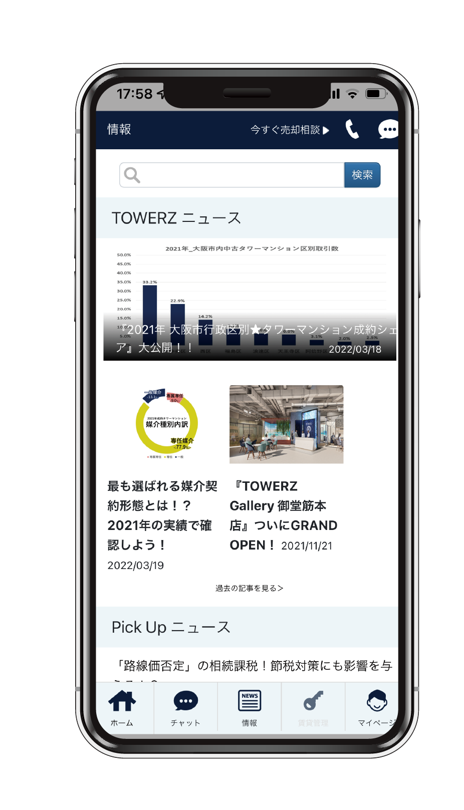 「TOWERZ CHECK」は、大阪市内のタワーマンションを対象として、その「現在の資産価値(売却査定額)」をワンクリックで表示させる機能を搭載したスマホ専用の資産管理アプリです。