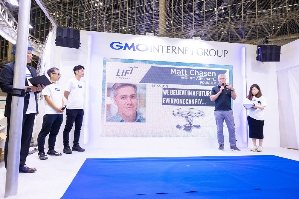 さらに、米国LIFT AIRCRAFT,Inc.のeVTOL「HEXA」の展示も実施しました。この機体は2023年3月14日(火)に大阪城公園内野球場にて、日本で初めて国の許可が必要な屋外スペースでパイロットが乗り組み有人飛行した機体で、GMOインターネットグループのグループ代表・熊谷正寿がパイロットを務めました。