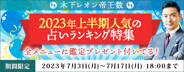 フジテレビ系列で放送中の占い番組『突然ですが占ってもいいですか?』で人気を博している木下レオン。ただいま、月額公式サイト『木下レオン◆帝王数』にて、『2023年上半期人気の占いランキング特集』を開催中です。2023年1月から6月までアクセスの高かった人気の占いメニューをランキング形式でご紹介。全メニュー1項目ずつ鑑定可能となっております。ぜひこの機会にお試しください。