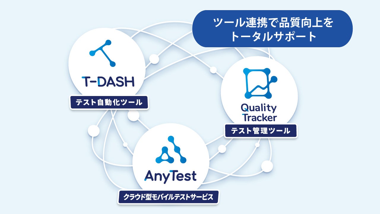 QualityTrackerは、当社の提供しているテスト自動化ツール「T-DASH」およびクラウド型モバイルテストサービス「AnyTest」と連携させることが可能です。