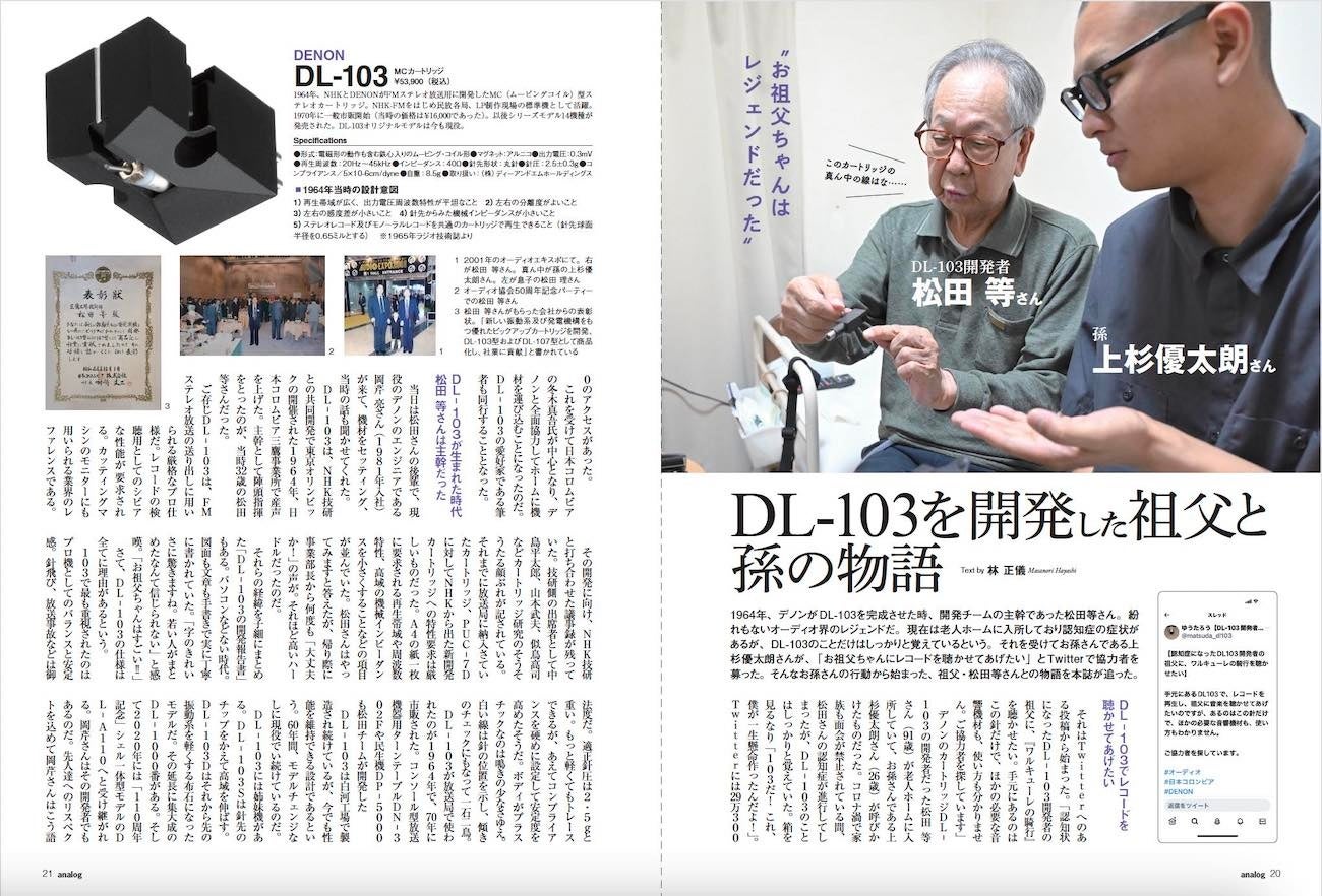 巻頭企画「DL-103を開発した祖父と孫の物語」。デノンのロングセラーMCカートリッジ「DL-103」を生んだ開発者である松田 等さん(91歳)のお孫さん、上杉優太朗さんが発信したTwitter投稿から始まった、祖父と孫の心温まる交流。世代を超えて受け継がれるアナログの力を感じさせてくれる感動のストーリーです。8名の方によるコラム「DL-103と私」も散りばめ、DL-103が生まれた背景や存在意義についても考察しました。(Text by 林 正儀 他)