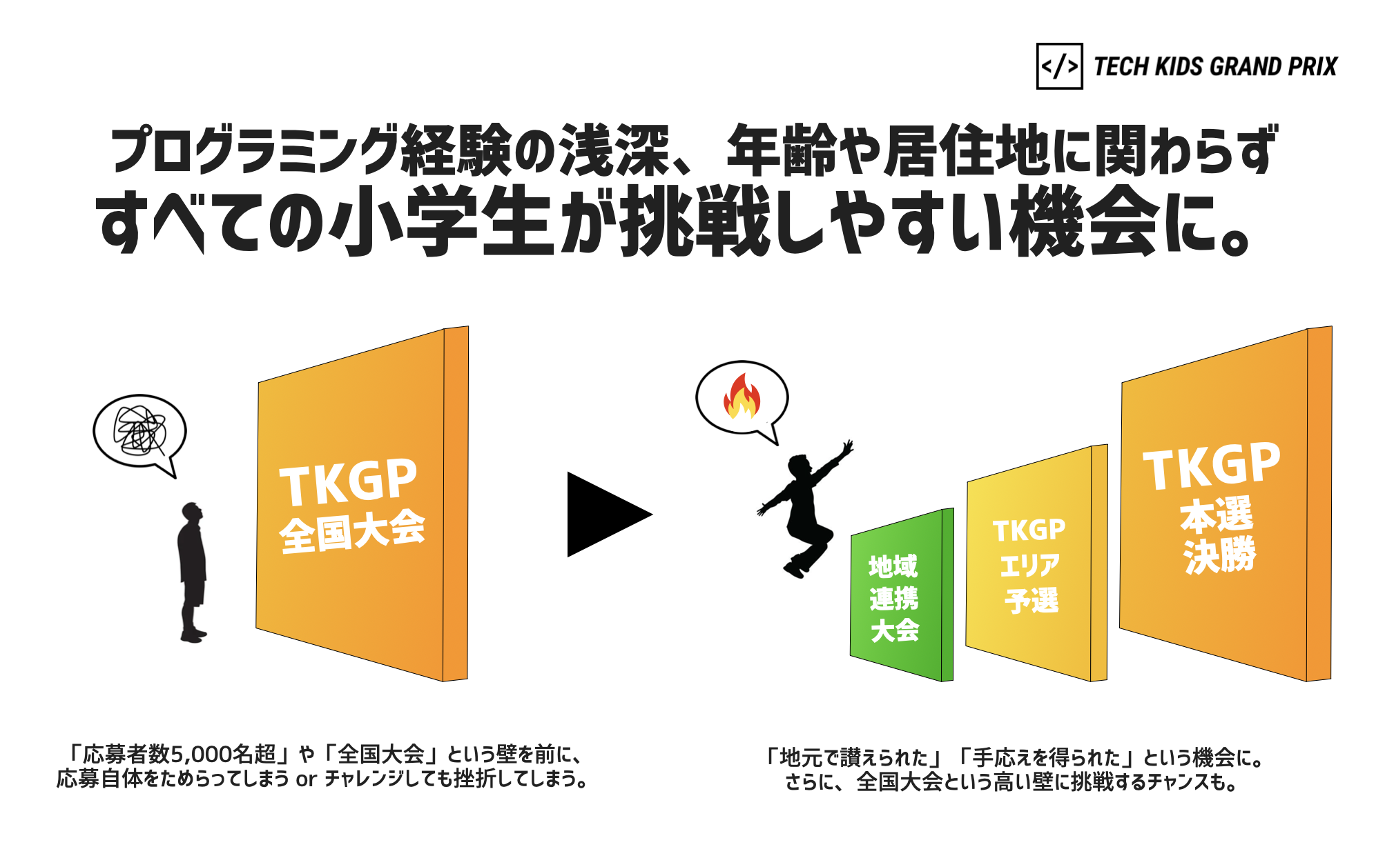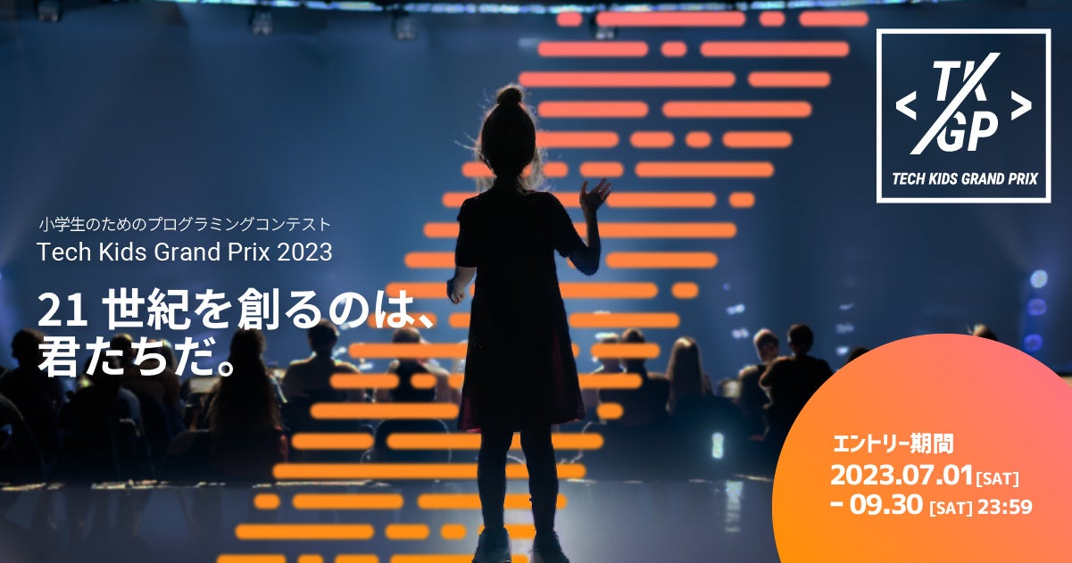 「Tech Kids Grand Prix」は、『21世紀を創るのは、君たちだ。』をスローガンに掲げる、これからの時代を担っていくすべての小学生に向けたプログラミングコンテストです。2018年度の開始より、延べ12,000人以上の小学生が参加している国内最大の大会です。毎年、熾烈な中間審査を勝ち抜いた上位10名が、東京渋谷の会場を舞台に、自身の作品や、作品にかける熱い想いをプレゼンテーションします。これまでのファイナリストの中には、「Tech Kids Grand Prix」での受賞後、大学教授との学術論文の制作、プロの技術者向けカンファレンスでの受賞、ゲーム制作会社と共同でのオリジナル作品リリース等、さまざまな分野で活躍する人材を輩出しており、次世代を担う人材の登竜門となっております。