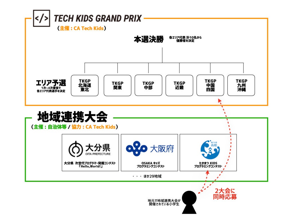 「Tech Kids Grand Prix」では、プログラミング必修化元年にあたる2020年度より、全国各地の都道府県や市町村等と連携し、その自治体等が主催する地元の小学生を対象としたプログラミングコンテストを「Tech Kids Grand Prix 地域連携大会」として同時開催しています。今年2023年度は、大阪府、大分県、高松市、那覇市など計29地域との連携が決定しており、各地域連携大会で1位に選ばれた方はエリア予選の3次審査に無条件で進出することができます。