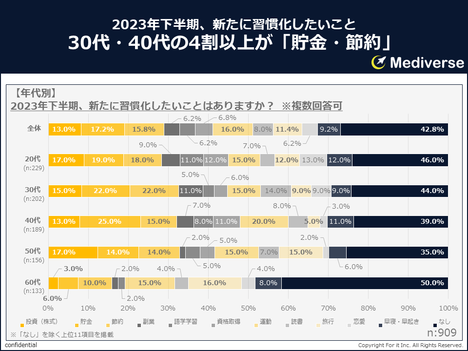 年代別に見ると、「新たに習慣化したいことはなし」を除けば、すべての年代において、前述のTOP5が「投資(株式)」「貯金」「節約」「運動」「旅行」が概ね首位となった。中でも、「貯金」「節約」は、30代・40代の4割以上を占めており、将来を見据えた行動の1つであることが推し量られる。