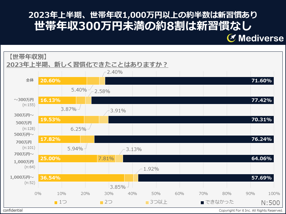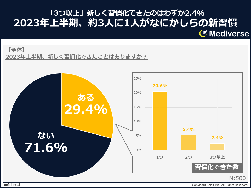 今回のアンケート調査結果では、2023年上半期を振り返ると、約3人に1人はなにかしらの新習慣ができており、新習慣化の有無や新しく習慣化した数は、性別・年代・世帯年収によってそれぞれ異なる傾向があることが判明いたしました。