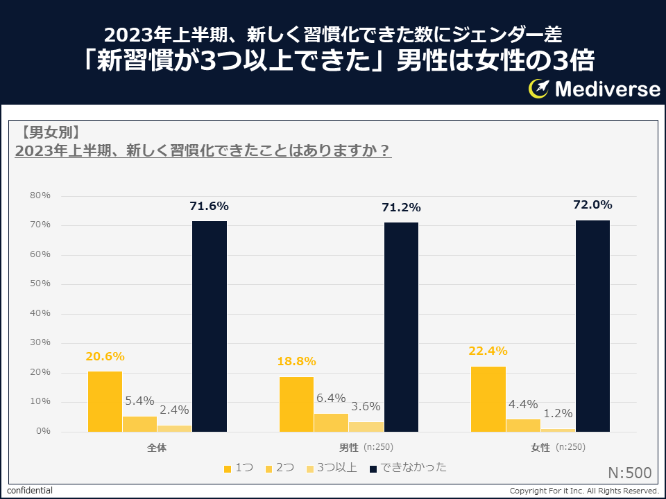 男女別に見ると、いずれも7割以上が「新習慣化できなかった」と回答していたが、新しく習慣化できた数にはジェンダー差が垣間見えた。新しく習慣化できた数「1つ」は女性、「2つ」「3つ以上」は男性の方が多く、とりわけ「3つ以上」は男性3.6%、女性1.2%で3倍差となっており、2023年上半期において、男性の方が新しく習慣を増やすことに積極的な傾向にあったことがうかがえる。