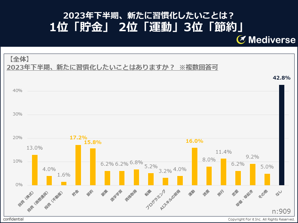 株式会社フォーイットが運営するWeb3メディア「Mediverse(メディバース)」は、『2023年上半期に新しく習慣化できたこと&2023年下半期に新たに習慣化したいことに関するアンケート』を独自で行いましたので、その調査結果をお知らせいたします。