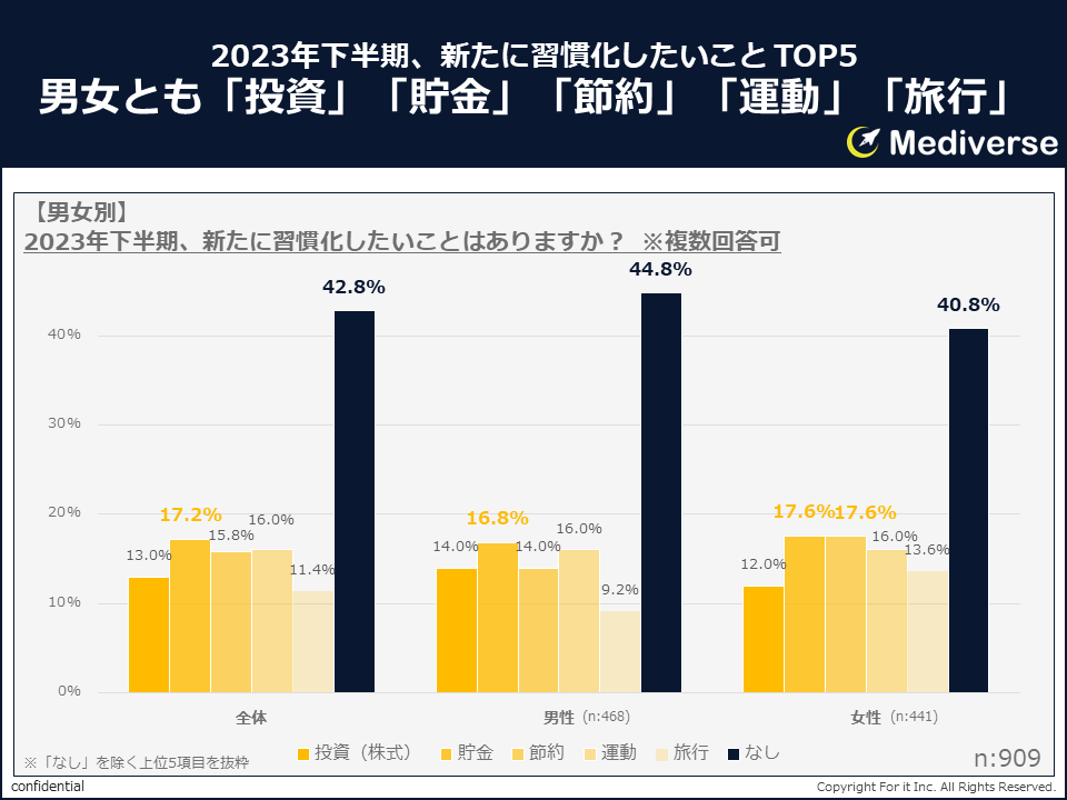 男女別に見ると、ジェンダー差なく、TOP5は「投資(株式)」「貯金」「節約」「運動」「旅行」であった。