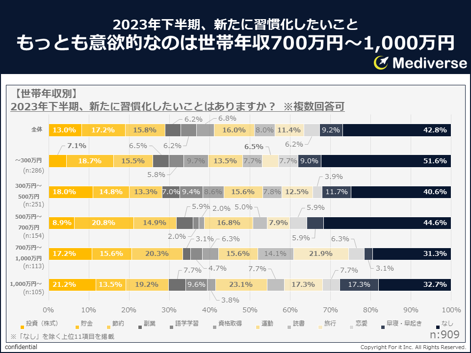 その一方で、2023年下半期に向けて、新しく習慣化したいことについては、性別・年代・世帯年収問わず、概ね同じ傾向であることから、新習慣への意欲はあるものの、ふたを開けてみると、性別・年代・世帯年収などの現実問題に大きく影響を受けざるを得ないことが推察されます。